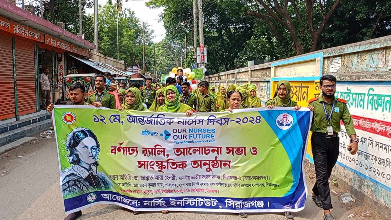 অন্জনা স্টাফ রিপোর্টার-"স্বাস্থ্য ব্যবস্থাপনায় শক্তিশালী নার্স নেতৃত্বের বিকল্প নেই— এই শ্লোগান নিয়ে আন্তর্জাতিক নার্স দিবস আধুনিক নার্সিং পেশার রূপকার ফ্লোরেন্স নাইটিঙ্গেলের জন্মদিন উপলক্ষ্যে প্রতিবছর সারা বিশ্বব্যাপী ন্যায় সিরাজগঞ্জে আন্তর্জাতিক নার্সেস দিবস উপলক্ষে বর্ণাঢ্য র্যালী প্রদর্শন, কেক কর্তন, আলোচনা সভা ও সাংস্কৃতিক অনুষ্ঠান করা হয়।