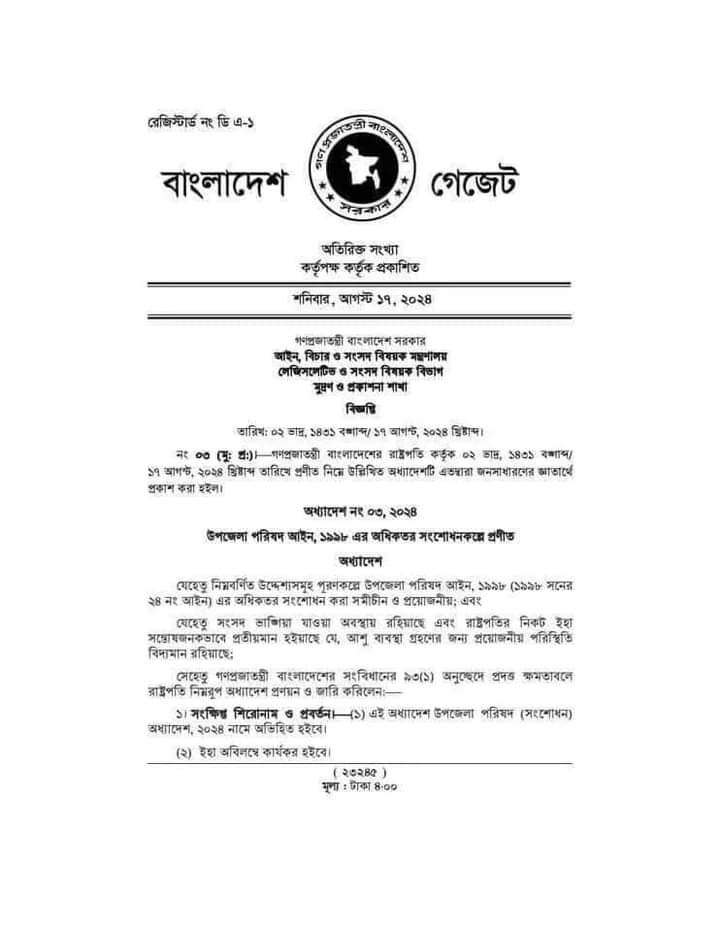 রাষ্ট্রপতি মো. সাহাবুদ্দিন শনিবার রাতে এসব অধ্যাদেশ জারি করেন। এর আগে শনিবার ‘স্থানীয় সরকার (সিটি করপোরেশন) (সংশোধন) অধ্যাদেশ, ২০২৪’; ‘স্থানীয় সরকার (পৌরসভা) (সংশোধন) অধ্যাদেশ, ২০২৪’; ‘জেলা পরিষদ (সংশোধন) অধ্যাদেশ, ২০২৪’ এবং ‘উপজেলা পরিষদ (সংশোধন) অধ্যাদেশ, ২০২৪’ এর খসড়া অনুমোদন করে উপদেষ্টা পরিষদ।