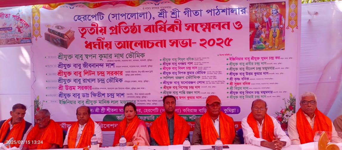 অনুষ্ঠানে শ্রীযুক্ত উত্তম চন্দ্র দাস, শ্রীযুক্ত মানিক চন্দ্র দাস, শ্রীযুক্ত বাবু নিমাই চন্দ্র দাস, শ্রীযুক্ত সুজন চন্দ্র দাস এর উদ্যোগে ৬০ জনকে বস্ত্র বিতরণ ৪০ জনকে প্রবীণ সম্মাননা ক্রেস্ট প্রধান করেন। এদিন অনুষ্ঠানে সার্বিক সহযোগিতা করেন কার্তিক চন্দ্র মজুমদার,সঞ্জয় দাস, শচীন্দ্র চন্দ্র দাস, মানিক চন্দ্র মজুমদার, অঞ্জন মজুমদার, টিংকু দাস, নান্টু দাস, মন্টু দাস বিমল, ভেনু দেব, সম্পদ শীল। এদিন বক্তব্যে বলেন আমাদের হিন্দু ধর্মের সকল সমাজে গীতা অনুষ্ঠান এবং ছোট ছোট বাবুদের কে গীতা কি ভাবে পাঠ করতে হয় সেটা শিখানো উচিত বলে মনে করেন বক্তরা তারা আরো বলেন আজকে এ অনুষ্ঠানে থেকে সবার কাছে অনুরোধ রইলো আপনারা সবাই সবার এলাকায় এমন গীতা স্কুল করবেন তা হলে আমাদের ধর্ম নিয়ে বাচ্চাদের জ্ঞান অর্জন ধর্মচর্চা করতে পারবে এদিন হিন্দু সম্প্রদায়ের বিভিন্ন এলাকার মানুষ উপস্থিত ছিলেন।