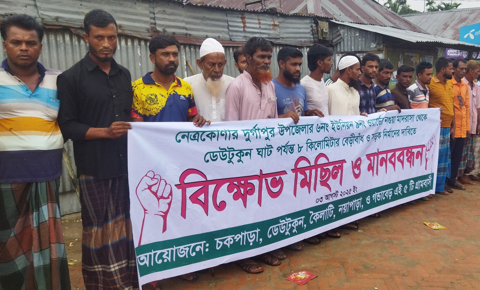 নেত্রকোনা জেলার দূর্গাপুর উপজেলার কাকৈরগড়া ইউনিয়নের ৯ নং ওয়ার্ডের নগুয়া থেকে ঢেউটুকোন বাজার পর্যন্ত ৮ কিলোমিটার বেড়ী বাঁধ ও সড়ক নির্মাণের দাবীতে মানববন্ধন অনুষ্ঠিত হয়েছে।
