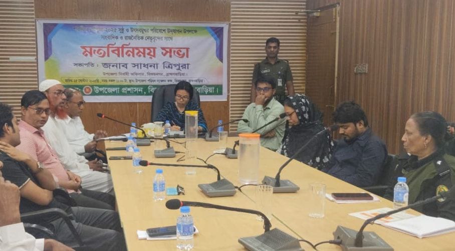 শারদীয় দুর্গাপূজা সুষ্ঠু, শান্তিপূর্ণ ও উৎসবমুখর পরিবেশে উদযাপন নিশ্চিত করতে ব্রাহ্মণবাড়িয়ার বিজয়নগর উপজেলায় রাজনৈতিক নেতৃবৃন্দ, সাংবাদিক ও প্রশাসনের উদ্যোগে মতবিনিময় সভা অনুষ্ঠিত হয়েছে।