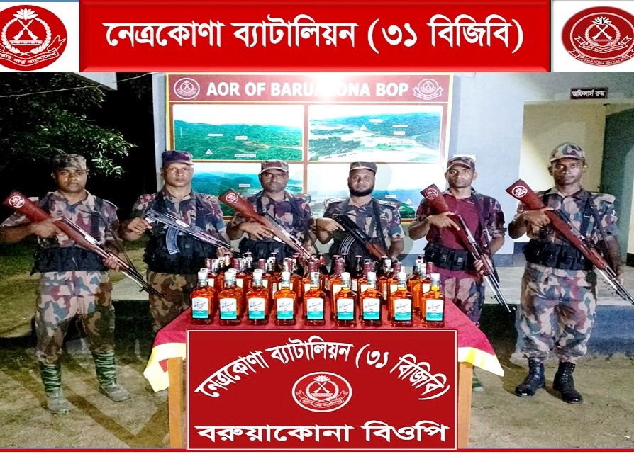 নেত্রকোনা ব্যাটালিয়ন(৩১ বিজিবি) এর অধিনায়ক লেঃ কর্নেল এ এস এম কামরুজ্জামান শনিবার বিকাল সাড়ে ৩ টার দিকে সাংবাদিকদের কাছে প্রেরিত এক প্রেস বিজ্ঞপ্তিতে জানান, বরুয়াকোনা বিওপি'র একটি টহল টিম গোয়েন্দা তথ্যের বিত্তিতে শুক্রবার রাত ৮টার দিকে কলমাকান্দা উপজেলার রংছাতি ইউনিয়নের পাতলাবন এলাকায় মাদক বিরোধী বিশেষ অভিযান চালিয়ে মালিক বিহীন অবস্থায় ৬৩ বোতল ভারতীয় মদ জব্দ করে।