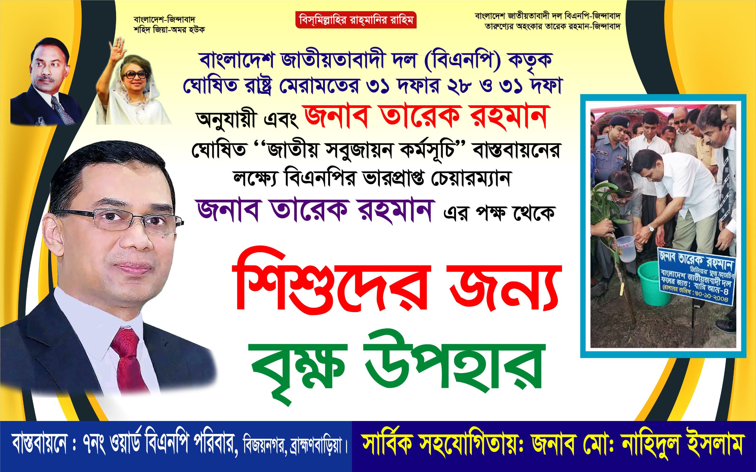 ১২ অক্টোবর ২০২৫ ইং রোজ রবিবার, দুপুর ১২ টা ৩০ মিনিটে, ব্রাহ্মণবাড়িয়া জেলার বিজয়নগর উপজেলার বুধন্তী ইউনিয়ন পৃথক পৃথক ভাবে, বারঘড়িয়া আলহাজ্ব ফরিদ মিয়া সরকারি প্রাথমিক বিদ্যালয় এবং বিন্নিঘাট সরকারি প্রাথমিক বিদ্যালয়ের প্রায় ৩০০ ক্ষুদে শিক্ষার্থী সহ স্থানীয় শিশুদের মাঝে তারেক রহমানের উপহার হিসেবে বিভিন্ন ফলজ, বনজ ও ঔষধি গাছের চারা বিতরণ করা হয়। এই উদ্যোগ একদিকে যেমন পরিবেশ সুরক্ষায় ভূমিকা রাখবে, অন্যদিকে তেমনি শিশুদের মধ্যে বৃক্ষরোপণের গুরুত্ব সম্পর্কে সচেতনতা বৃদ্ধি করবে।