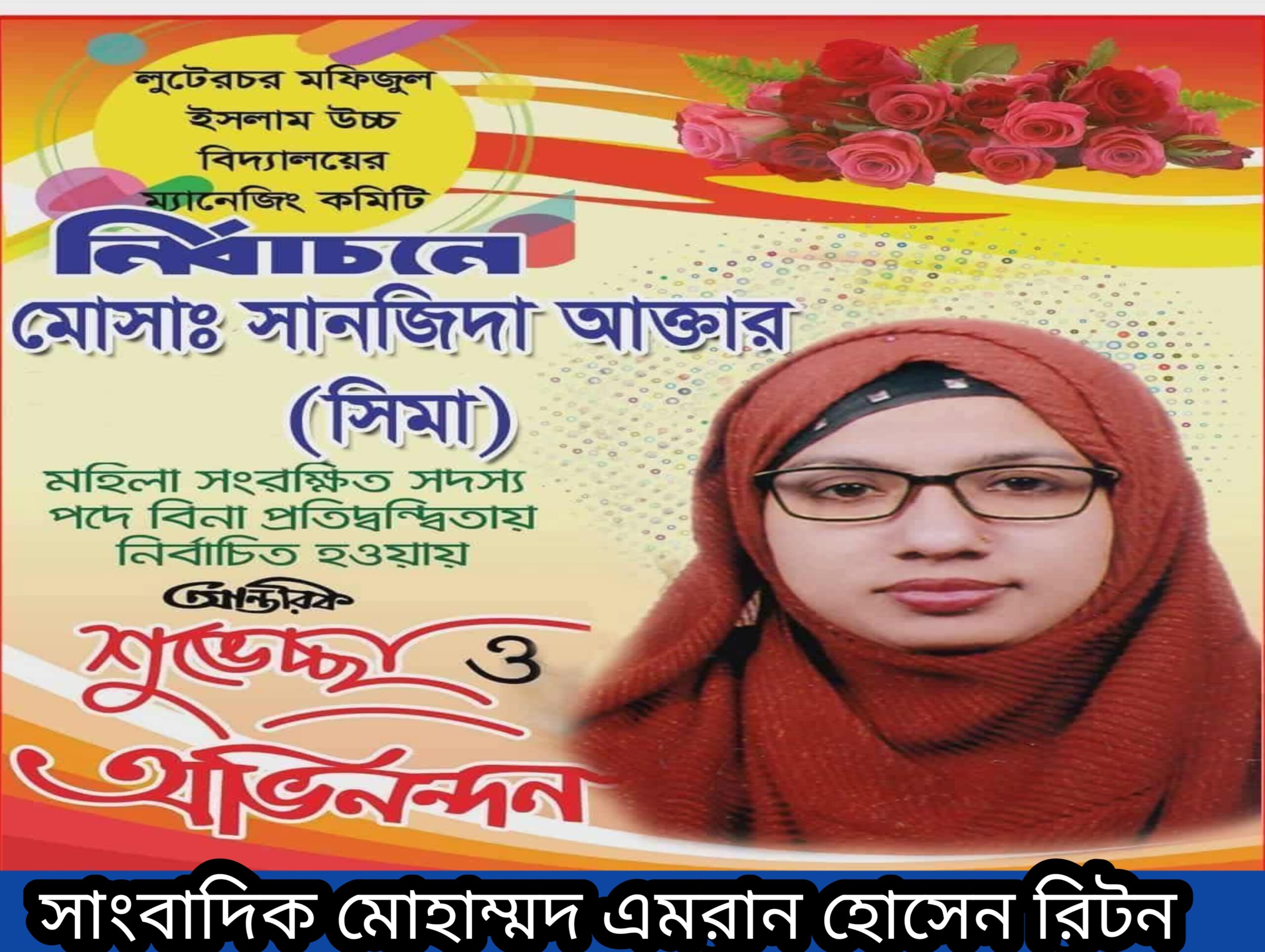 কুমিল্লা জেলার মেঘনা উপজেলার লুটেরচর ইউনিয়ন যুবদলের আহ্বায়ক মোঃ জাহিদুল ইসলাম গাফফার মেম্বারের ছোট বোন সানজিদা আক্তার সীমা লুটেরচর মফিজুল ইসলাম (দুধ মিয়া) উচ্চ বিদ্যালয়ের ম্যানেজিং কমিটির মহিলা সংরক্ষিত সদস্য পদে বিনা প্রতিদ্বন্দ্বিতায় নির্বাচিত হয়েছেন।