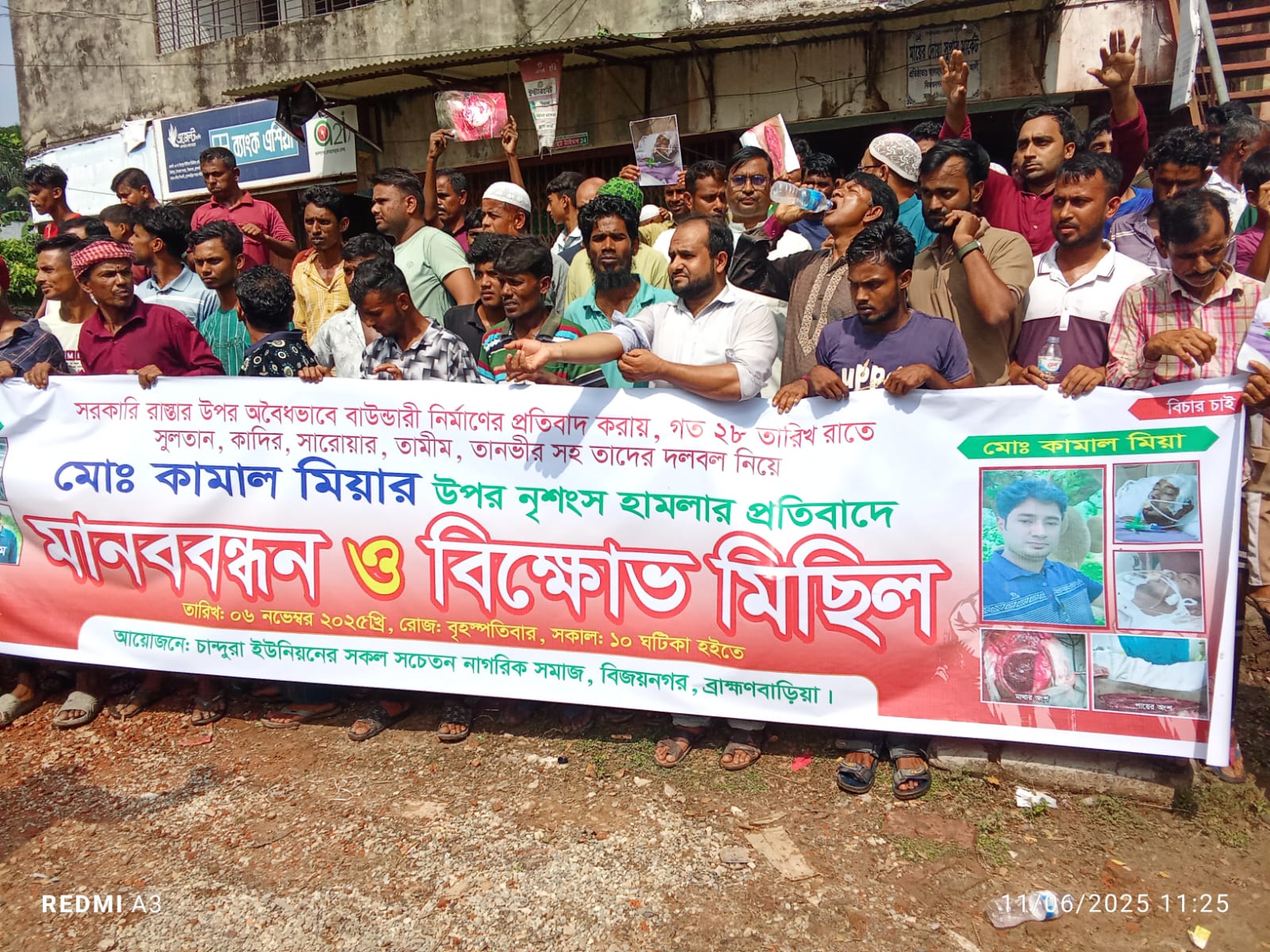 ব্রাহ্মণবাড়িয়ার বিজয়নগর উপজেলার চান্দুরা ইউনিয়নের মিরপুর গ্রামে সরকারি রাস্তা দখলকে কেন্দ্র করে ঘটে যাওয়া এক নৃশংস হামলায় গুরুতর আহত হয়েছেন প্রবাসী কামাল মিয়া। বর্তমানে তিনি ঢাকা ইসলামিয়া হাসপাতালে লাইফ সাপোর্টে মৃত্যুর সাথে পাঞ্জা লড়ছেন। এই পৈশাচিক হামলার প্রতিবাদে এলাকাবাসী বিক্ষোভে ফেটে পড়েছে এবং জড়িতদের দ্রুত গ্রেফতার ও দৃষ্টান্তমূলক শাস্তির দাবিতে বিজয়নগর থানা ঘেরাও করে বিক্ষোভ সমাবেশ করেছে।