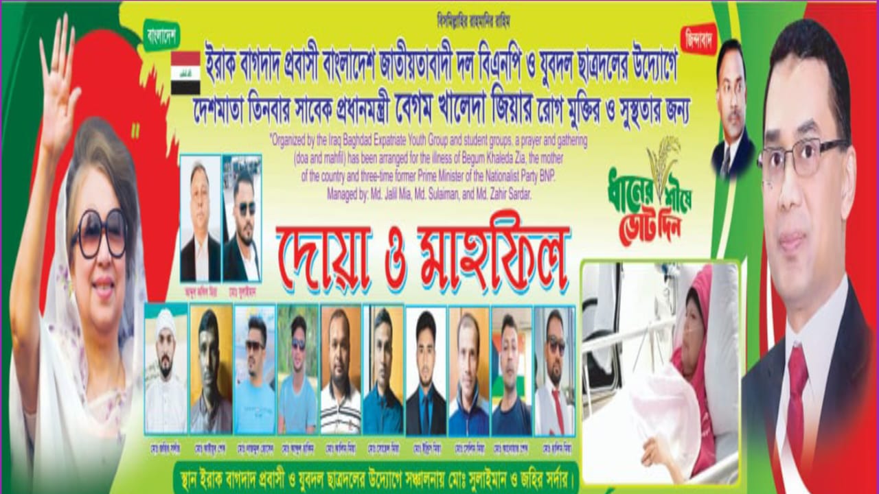 ইরাকের রাজধানী বাগদাদে বাংলাদেশ জাতীয়তাবাদী দল (বিএনপি)-এর চেয়ারপারসন, দেশনেত্রী ও তিনবারের সাবেক প্রধানমন্ত্রী বেগম খালেদা জিয়ার আশু রোগমুক্তি ও সুস্বাস্থ্য কামনায় দোয়া ও মিলাদ মাহফিল অনুষ্ঠিত হয়েছে।