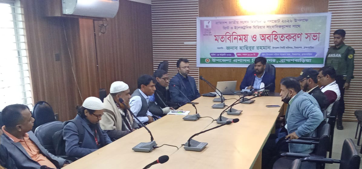 ত্রয়োদশ জাতীয় সংসদ নির্বাচন ও গণভোট ২০২৬ উপলক্ষে বিজয়নগর উপজেলা প্রশাসনের উদ্যোগে প্রিন্ট ও ইলেকট্রনিক মিডিয়ার সাংবাদিকদের সাথে এক মতবিনিময় ও অবহিতকরণ সভা অনুষ্ঠিত হয়েছে।