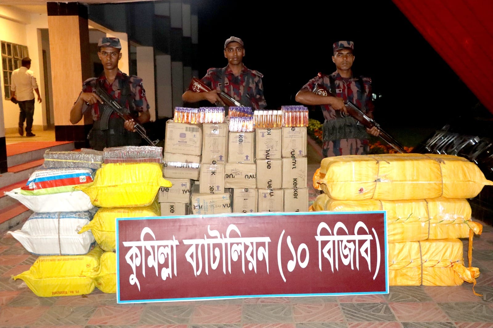 উক্ত অভিযানে জব্দকৃত মালামালের মধ্যে রয়েছে, বিপুল পরিমাণ ভারতীয় বাজি,উন্নত মানের ভারতীয় কসমেটিক্স সামগ্রী,০১টি পরিবহনকারী যানবাহন।