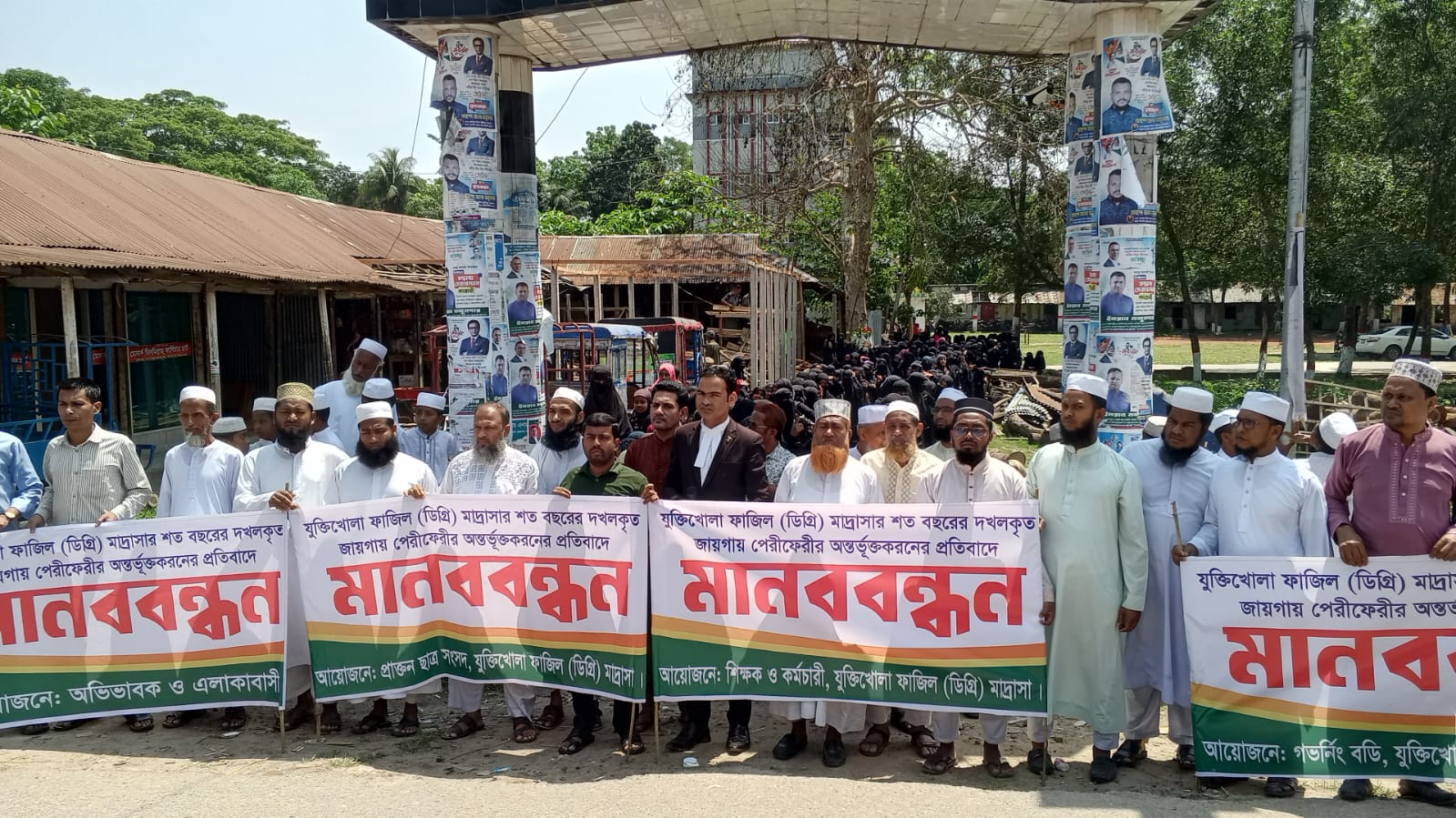৭ এপ্রিল সকাল সাড়ে দশটায় যুক্তিখোলা বাজারের মেইন সড়কে অনুষ্ঠিত মানববন্ধনে বক্তব্য রাখেন, যুক্তিখোলা ফাজিল মাদ্রাসার ম্যানেজিং কমিটির সভাপতি অ্যাডভোকেট মোঃ মোতালেব হোসেন।