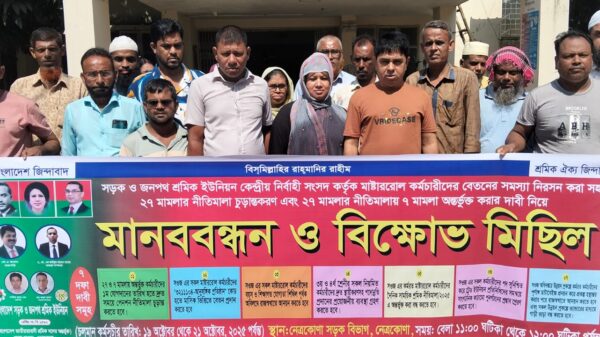 জেলা প্রতিনিধি (দ্বীপক চন্দ্র সরকার), নেত্রকোণা: সড়ক ও জনপথ শ্রমিক ইউনিয়ন কেন্দ্রীয় নির্বাহী সংসদ কর্তৃক মাষ্টাররোল কর্মচারীদের বেতন সমস্যা নিরসন করা সহ ২৭ মামলার নীতিমালা চুড়ান্ত করণ এবং ২৭